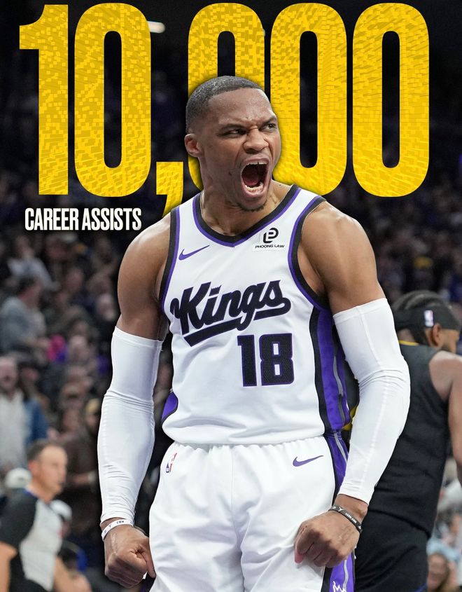 国王不敌森林狼,这场比赛拉塞尔-威斯布鲁克顶替了丹尼斯-施罗德的先发控卫席位,他完成了个人10000助攻的里程碑,虽然最终国王输球了,但这个夜晚威少绝对是整个NBA最吸睛、最闪耀的那个人。