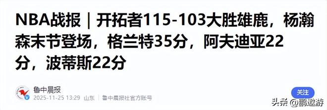 鲁中晨报(NBA战报|开拓者115-103大胜雄鹿,杨瀚森末节登场,格兰特35分,阿夫迪亚22分,波蒂斯22分2025.11.25)